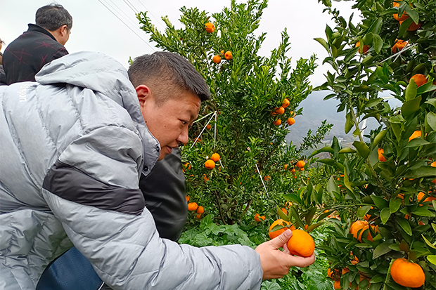 圖為聶珂正在查看橘子生長(zhǎng)情況
