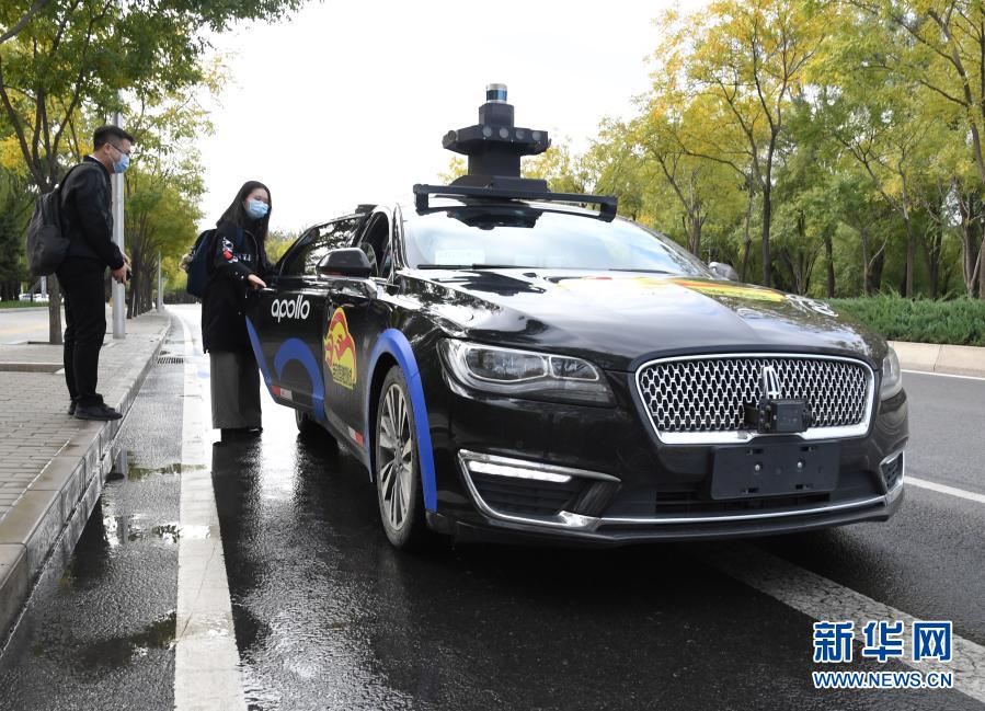 市民在北京市海淀區(qū)稻香湖路的百度自動(dòng)駕駛出租車指定上車點(diǎn)乘車(2020年10月14日攝)。新華社記者 任超 攝