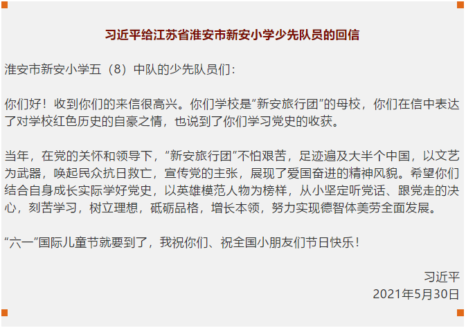 在“六一”國際兒童節(jié)到來之際,中共中央總書記、國家主席、中央軍委主席習(xí)近平5月30日給江蘇省淮安市新安小學(xué)的少先隊(duì)員們回信,對他們予以親切勉勵(lì),并祝他們和全國小朋友們節(jié)日快樂。