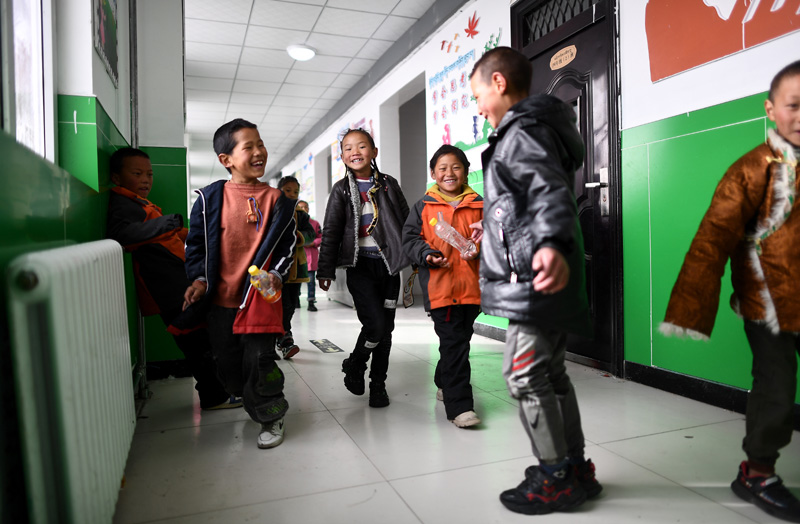 2021年3月26日,青?,敹嗫h民族寄宿制中學(xué)二年級(jí)的學(xué)生在課間玩耍。該校目前采用清潔取暖方式,學(xué)生的學(xué)習(xí)和生活環(huán)境大為改善。新華社記者 張宏祥 攝