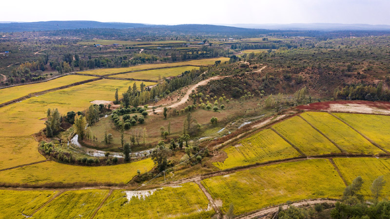 2020年9月26日拍攝的陜西省靖邊縣黃蒿界鎮(zhèn)馬季溝村稻田(無(wú)人機(jī)照片)。近年來(lái),靖邊縣實(shí)施了“三北”防護(hù)林、退耕還林、流域治理等生態(tài)建設(shè)工程,北部沙漠區(qū)裸露明沙完全消失,中部農(nóng)田林網(wǎng)蔚然成蔭,南部山區(qū)夏季綠色滿(mǎn)山。新華社記者 陶明 攝